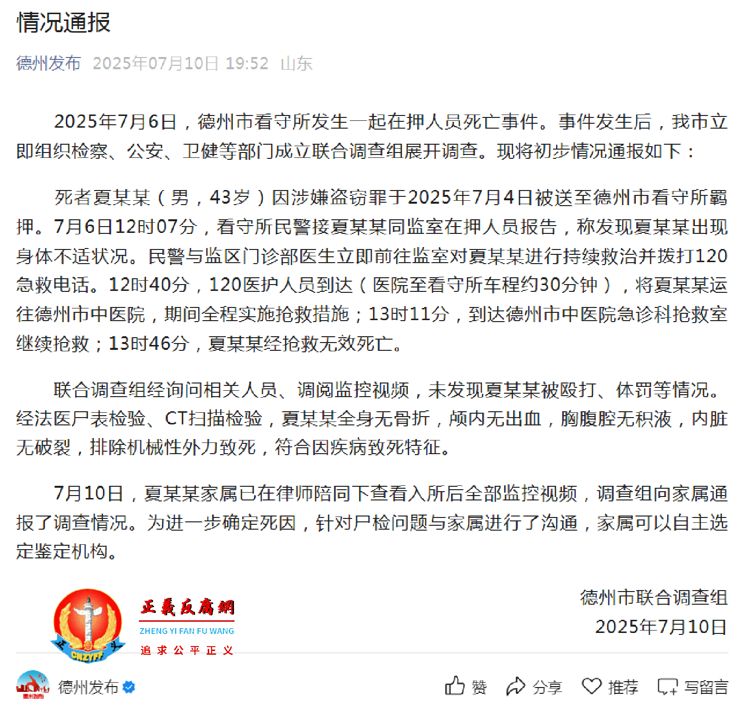 7月10日晚19:52分,山东德州市联合调查组发布情况通报:2025年7月6日,德州市看守所发生一起在押人员死亡事件。事件发生后,该市立即组织检察、公安、卫健等部门成立联合调查组展开调查。