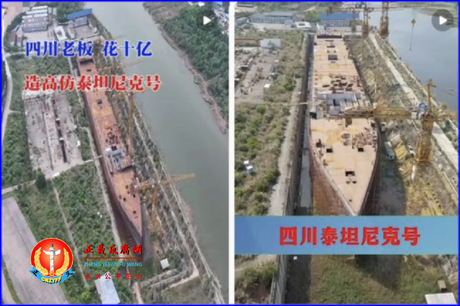 据网民在社交平台上发布的一段航拍视频,藏身于四川省大英县郪江岸边地船坞内一艘山寨版(媒体称复刻版)“泰坦尼克号”初具雏形,但銹迹斑斑。建设现场一片荒凉,船只模型以及周围的脚手架、吊车全部生锈,现场空无一人。