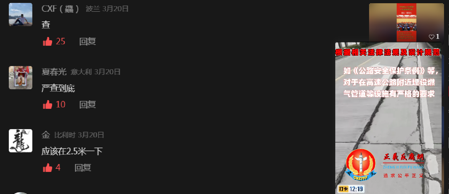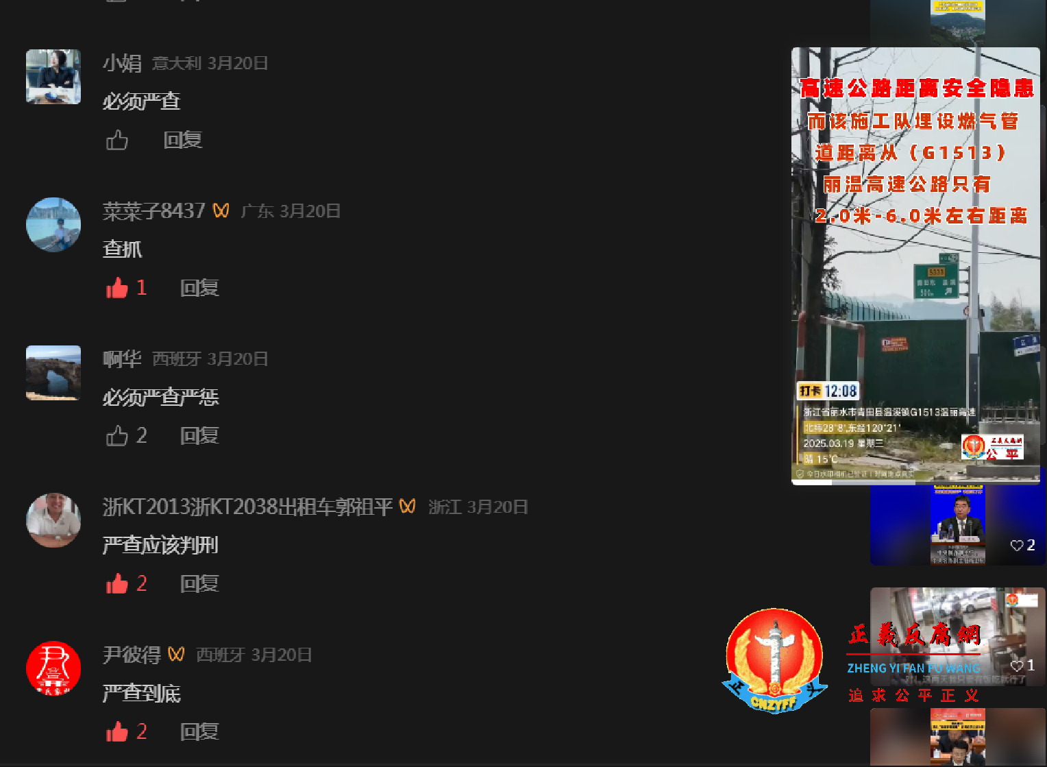 ▲网友评论“温溪天然气标段”地下燃气管道埋设的存在豆腐渣工程、严重工程质量问题,涉嫌偷工减料、违规施工不达标,工程监理部门隐蔽工程验收不合格走过场。(图片来源:视频号@法说天下真相 / 评论区截图)