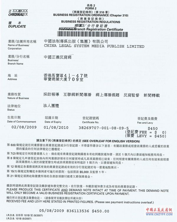 中国正义反腐网在香港特别行政区政府登记许可证号:38269707-001-08-09-5