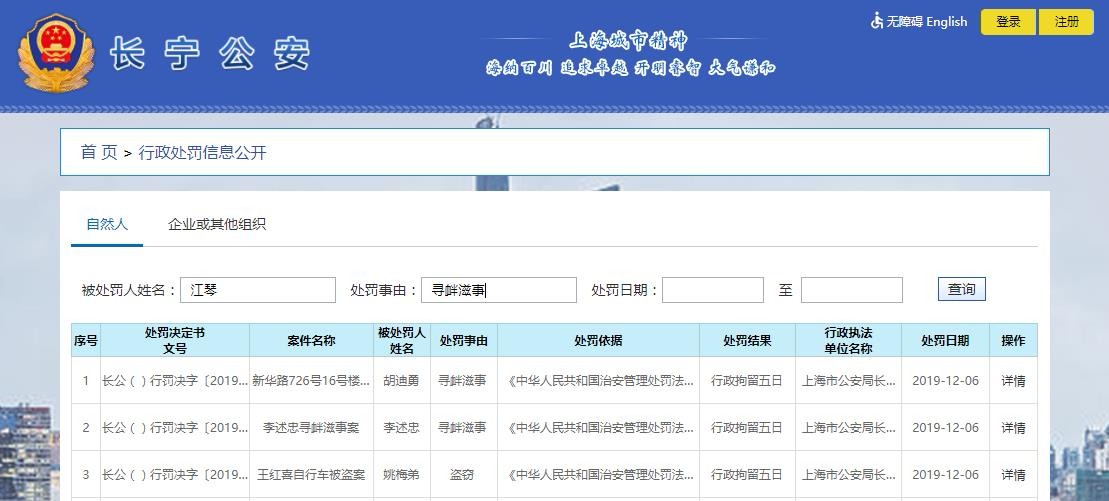 上海市公安局长宁分局网站系统查询,填写:江琴和寻衅滋事(截图)