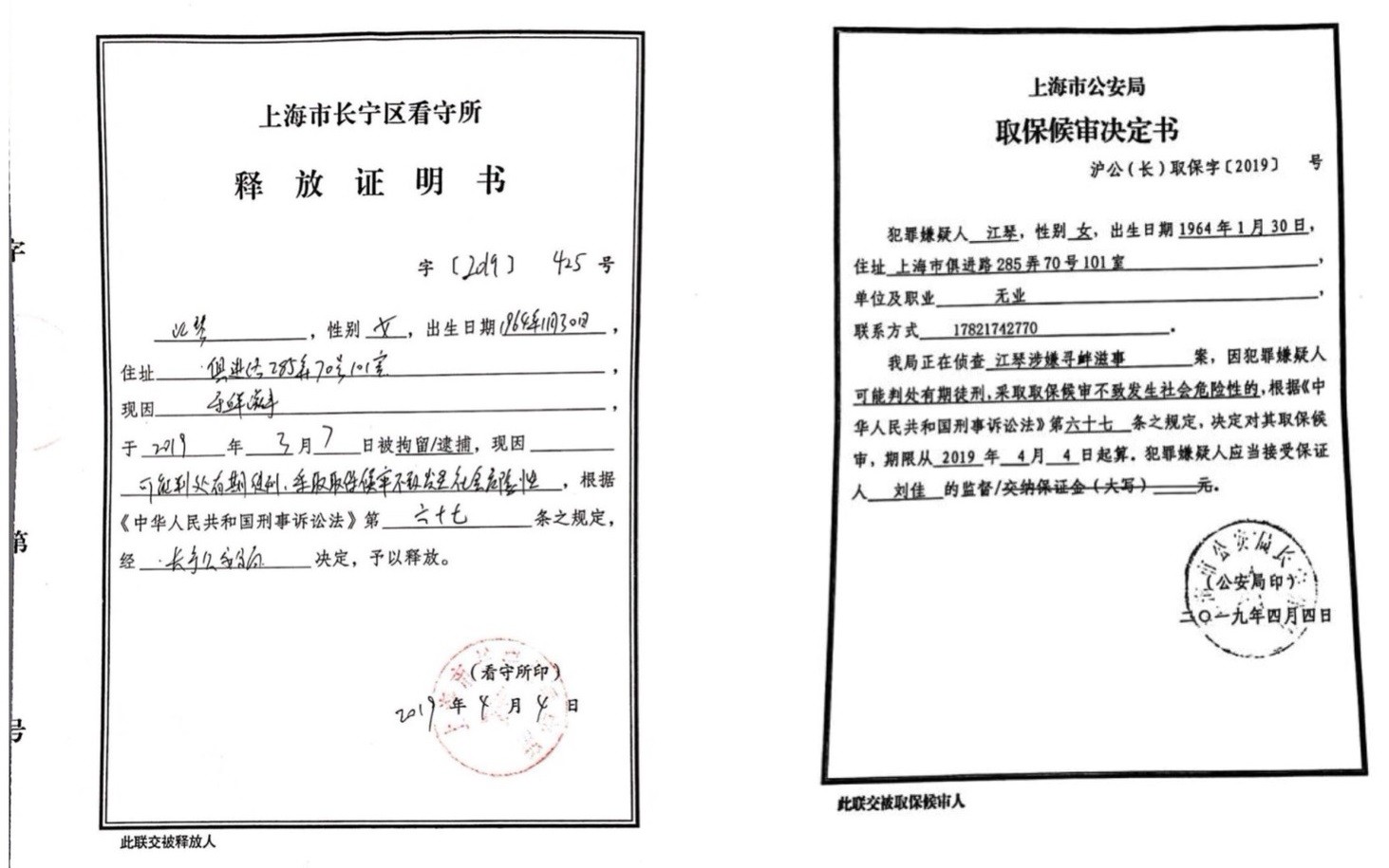 江琴涉嫌寻衅滋事案。2019年4月4日上海市长宁区看守所释放证明书和上海市公安局取保候审决定书。(受访者供图)
