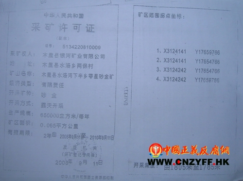多多还告诉记者,他曾经在县城看到过一份张贴的国土局发布的公告,木里银河矿业有限公司经协议转上取得的水洛河零星砂金采矿权证,采矿权证号为5134220810009。多多清楚地记得,银河矿业公司采矿的范围是铁索桥50以下600米的河道。多多的这一说法,记者从木里县国土局调出的采矿权证证实,采矿权证号为5134220810009的范围是铁索桥50以下600米的河道。