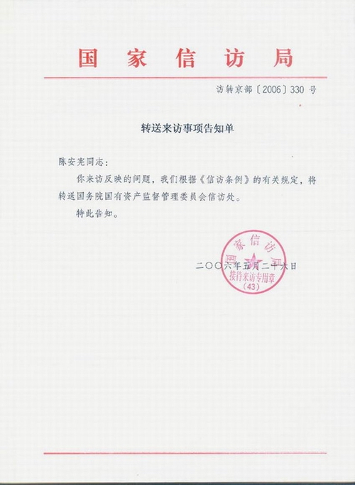 摘录“江西九江市资产核查小组”5月22日的汇报:…… “市政府:2007年2月7日上午,原九江锁江楼发电厂综合厂职工陈安宪等80余人围堵(江西)省政府南大门集体上访,反映江西省电力公司收回了该厂土地及买断工龄、置换身份,但未解决职工养老保险问题”…