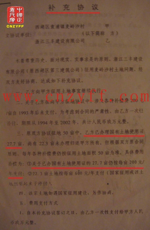 1993年时任麦岭沙村党支部书记郑关海与当时负责经营袁浦乡办企业,杭州市西湖区第三建筑公司总经理,妻弟葛品荣策划编造三建公司(简称)因筹建“中外合资公司”需要征用麦岭沙村村民承包耕种的集体土地,这个虚构用地事由,窜通原袁浦乡党委委员吴兴根共同参与合作,隐瞒着麦岭沙村全体村民。在未经全体村民签民同意,并与拥有承包经营权证的部分村民签订征地安置补偿协议的情况下,于1993年6月25日以每亩补偿1400元价钱,当时超市场低价,50年征用时间,名为征地,实为租地的秘密书面征地合同。由麦岭沙村原党支部书记,郑关海代表村委会与其妻弟,原杭州市西湖区第三建筑工程有限公司总经理葛品荣代表公司签名盖章,经原袁浦乡党委委员吴兴根参与合作,并加盖原袁浦乡党委和乡政府公章,作见证。实际上当杭州市西湖区第三建筑工程有限公司征用该麦岭沙地块后并未实际筹建所谓“中外合资企业”,也未建造任何形式的公司厂房,倒将该地块长期抛荒6年,仅只堆放了几十块水泥预制板。长期不让村民耕种,又未按时向被用地村民自觉支付土地安置补偿款额。
