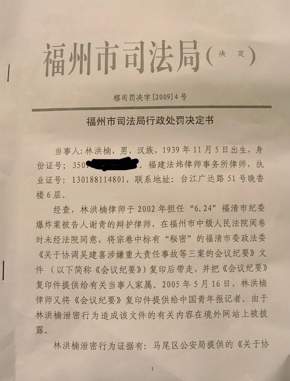 按照福州市司法局《行政处罚决定书》的指控,林洪楠律师于2002年担任“6.24”福清爆炸案被告人谢青的辩护律师,在福州市中级人民法院阅卷时未经法院同意,将卷宗中标有“秘密”字样的《关于协调吴建喜涉嫌重大责任事故等三案的会议纪要》复印件提供给有关当事人家属。2005年5月16日,林洪楠律师又将《会议纪要》复印件提供给中国青年报记者。由于林洪楠泄密行为造成该文件的有关内容在境外网站上被披露。
