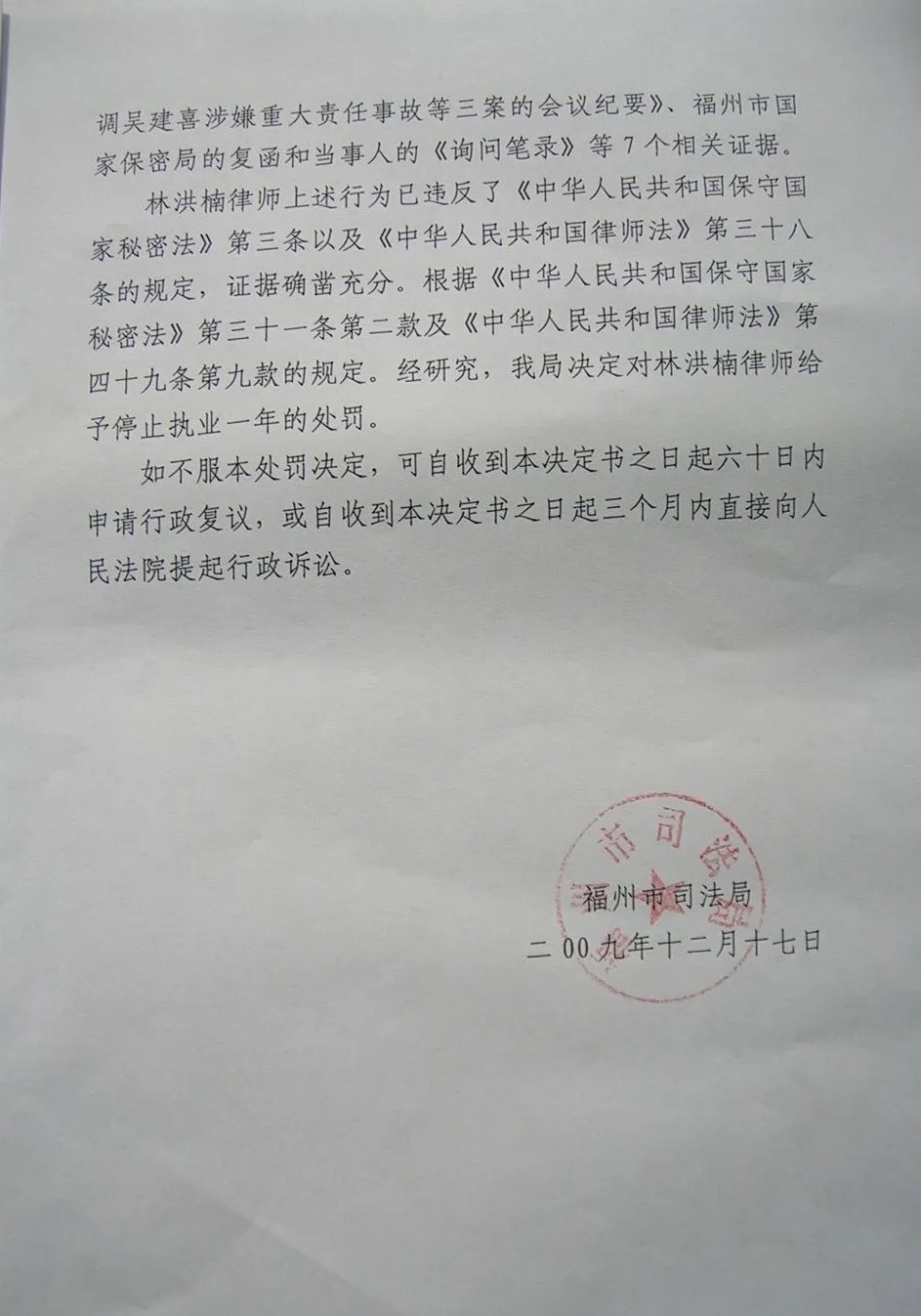随即,林洪楠律师递交申请要求召开听证会。2009年12月17日,福州市司法局作出行政处罚决定,对林洪楠律师处以停止执业一年的处罚。